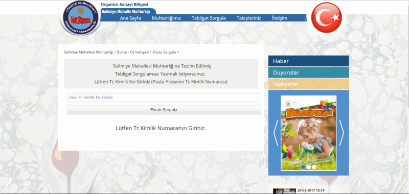 Ayrıca muhtarlarımız için web sitesi ile beraber kolaylıklarda sunmaya devam ediyoruz. Tebligat sorgulama ile vatandaşa gelen tebligatları siteye ekliyoruz vatandaş T.C kimlik numarası ile tebligatı olup olmadığını sorgulayabiliyor varsa gelip tebligatını muhtarlıktan teslim alıyor. Muhtarlarımızda tebligat takibini kime ne zaman tebligat gelmiş kim teslim almış gibi bilgileri şifre ile girilebilen muhtara ait ekrandan görebilmektedir.